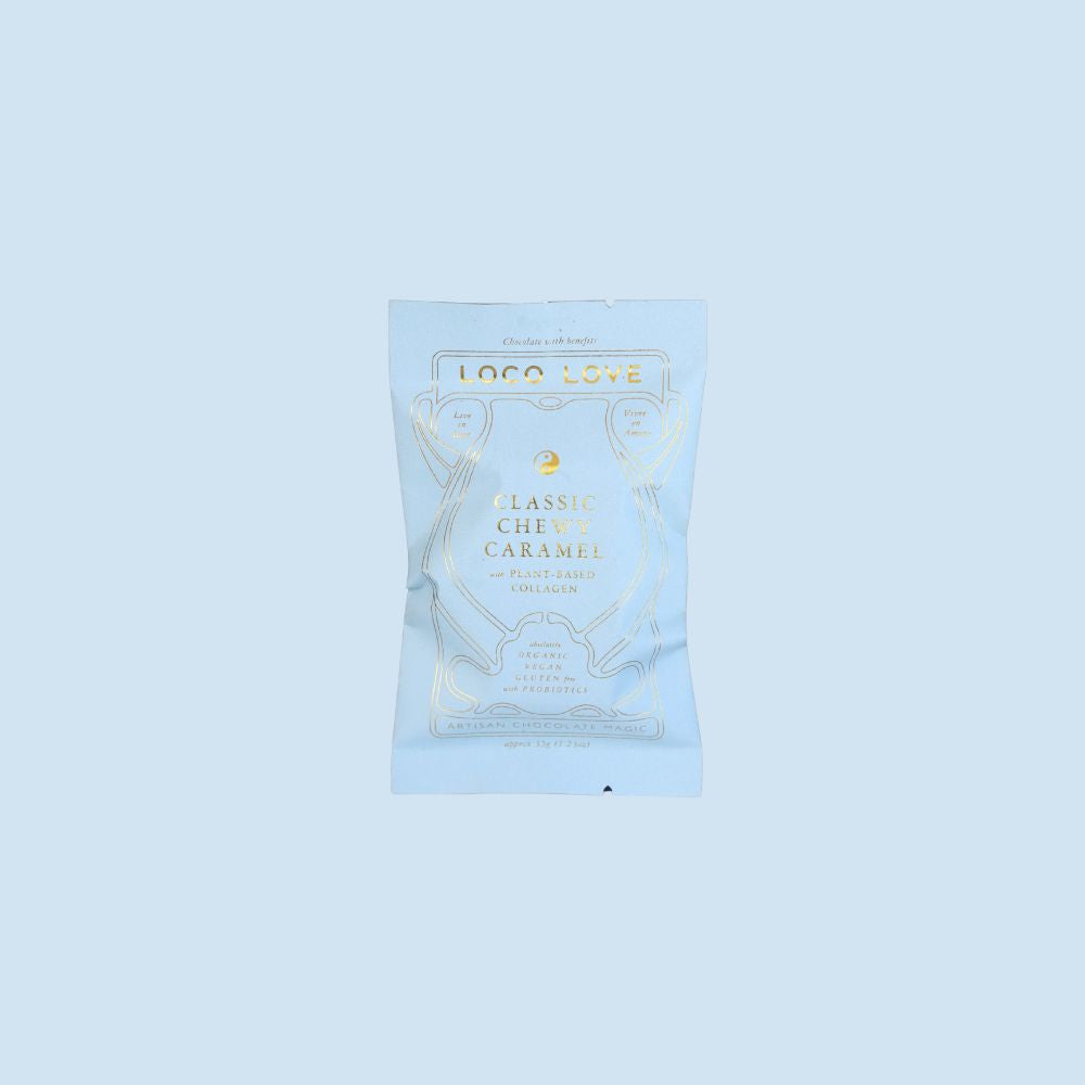 Classic Chewy Caramel Nut Free. A high-vibe, irresistibly chewy and gooey caramel, encased in 70% dark chocolate and infused with vegan collagen. This gourmet treat is a textural delight, perfect for special occasions.