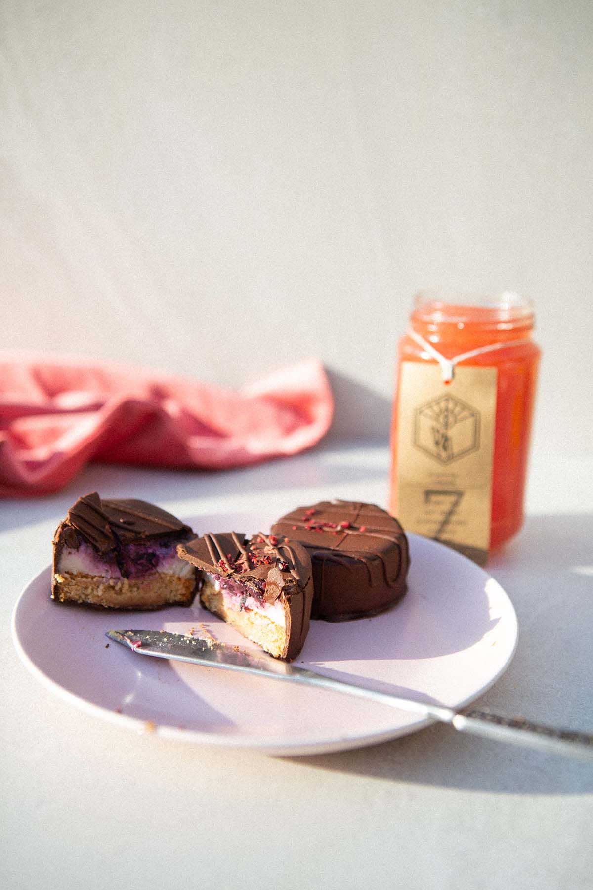 Our Wagon Wheels are completely plant-based, with no refined sugars. A crunchy biscuit base, with a layer of strawberry chia jam, coated in decadent vegan dark chocolate.